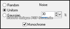 Adjust> Add/Remove Noise> Add Noise ... with the same settings as earlier Layers> New Raster Layer ... Flood Fill with Black Selections> Select All ... Selections> Modify> Contract by 1 ... Hit DELETE on your keyboard Selections> Select None ... Layers> Arrange> Bring to Top Add Copyrights and your Name