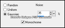 Activate the Tube layer and apply a suitable Drop shadow ... Layers> New Raster Layer Flood Fill with your Foreground Color Adjust> Add/Remove Noise> Add Noise ... with the same settings as earlier Selections> Select All ... Selections> Modify> Contract by 2 ... Hit DELETE on your keyboard Selections> Select None Effects> Eye Candy 6> Gradient Glow ... with the same settings as earlier