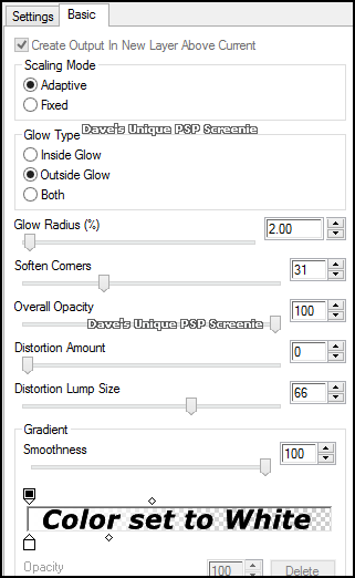 Hit DELETE on your keyboard ... Selections> Select None Change this layers Blend Mode to Luminance(L) ... Layers> Merge> Merge Down Important Step: Selections> Select All ... Selections> Clip to Canvas ... Image> Crop to Selection Effects> Eye Candy 6> Gradient Glow ... with the following settings