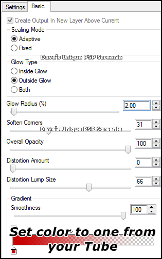 Effects> Eye Candy 6> Gradient Glow ... same settings as earlier Apply a suitable Drop Shadow ... Activate the bottom Tube layer Effects> Mura's Meister> Copies ... *Line ... change the Number to a suitable amount (I changed it to 6) Layers> New Raster Layer ... Flood Fill this layer with Black ... Layers> Arrange> Move Down Activate the bottom Tube layer again and change it's Blend Mode to Luminance or Luminance(L) Layers> Merge> Merge Down