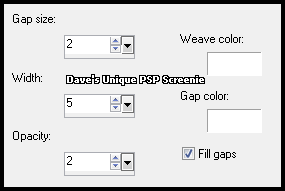 Layers> New Raster Layer ... Load the Selection I provided with this Tutorial (Spawns-LuckoftheIrish) Flood Fill the Selection with your Background color Effects> Texture Effects> Weave ... with the following settings