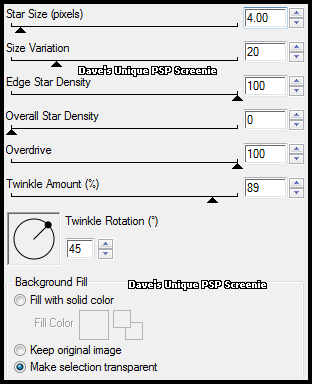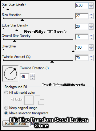 Rename this layer xeno and Duplicate it three times (for a total of 4) Activate the xeno layer Effects> Xenofex> Constellation ... with the following settings
