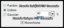 Change your Foreground to Black and your Background to a Color from your Tube Activate the Black Lines layer Adjust> Hue/Saturation> Hue/Saturation/Lightness play around with the settings until your lines are a color you are happy with Adjust> Add/Remove Noise> Add Noise ... with the following settings