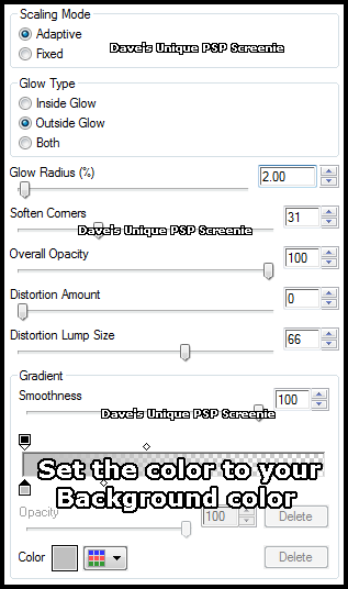 Effects> Eye Candy 6> Gradient Glow ... change the Glow Radius to 1 and the color to Black Paste your Tube as a New Layer position on the Right side of your Tag and apply a suitable Drop Shadow Layers> New Raster Layer ... Flood Fill with Black ... Selections> Select All Selections> Modify> Contract by 2 ... Hit DELETE on your keyboard ... Selections> Select None Effects> Eye Candy 6> Gradient Glow ... change the color to your Background color