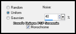 Change your Foreground and Background to 2 Bright colors from your Tube Activate the Middle Dark Grey Strip layer Selections> Select All ... Selections> Float ... Selections> Defloat Flood Fill the Selection with your Foreground color Adjust> Add/Remove Noise> Add Noise ... with the following settings
