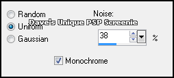 Activate the Copy (7) of Marble Layer Paste your Tube as a New Layer ... position where you like and add a suitable Drop Shadow Layers> New Raster Layer ... Flood Fill with your Foreground color Selections> Select All ... Selections> Modify> Contract by 1 Edit> Clear ... Selections> Select None Adjust> Add/Remove Noise> Add Noise ... with the following settings
