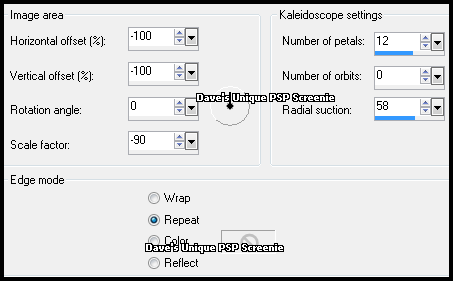 Open a New Image 600x600 ... Flood Fill with your Gradient Layers> Duplicate ... Activate the Bottom layer Effects> Reflection Effects> Kaleidoscope ... with the following settings