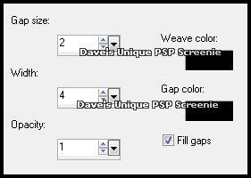 Open a New Image 600x250 Flood Fill with your Foreground color ... Layers> New Raster Layer Flood Fill with your Background color ... Effects> Texture Effects> Weave ... with the following settings