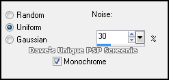 Layers> New Raster Layer ... Flood Fill with a color from your Tube Selections> Select All ... Selections> Modify> Contract by 2 Edit> Clear ... Selections> Select None Adjust> Add/Remove Noise> Add Noise ... with the following settings